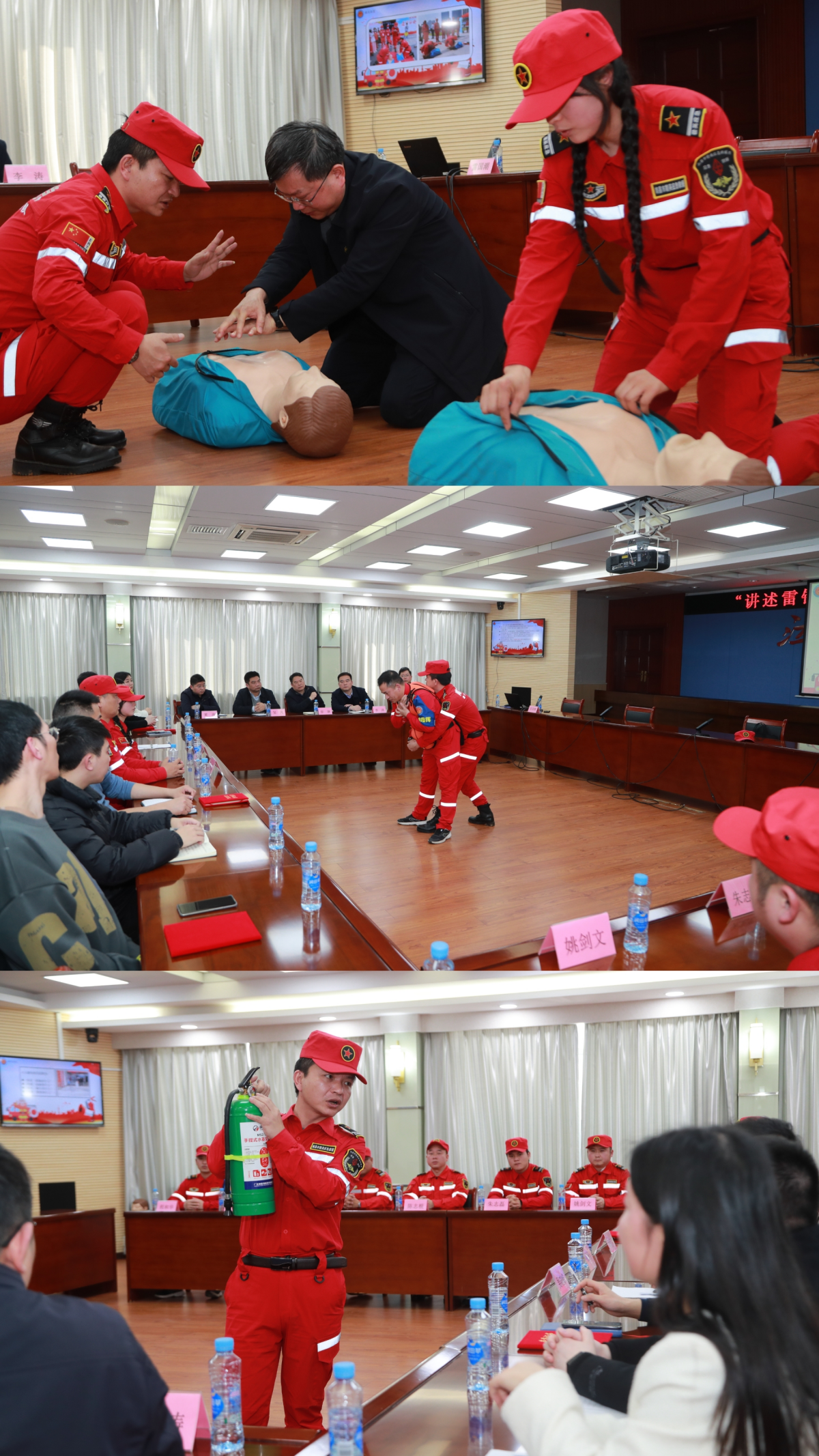 随后,赣英应急救援队还采取“理论+实操”的方式,现场教学了心肺复苏术、海姆立克急救法、灭火器规范使用方法等应急救援技能。参与活动的干警们积极参与,跟随规范教学指导,利用模拟道具进行胸外按压、人工呼吸等实操练习,在互动教学中提升应对、处置突发事件的意识和能力。