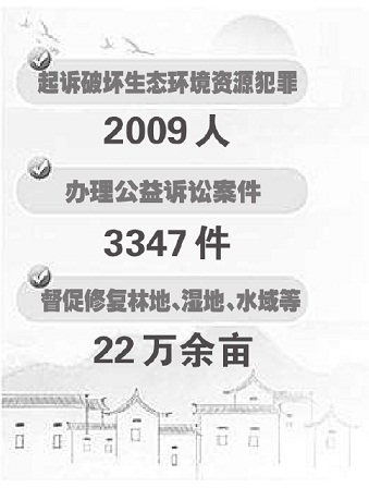 护航美丽江西建设,深化“河(湖、林)长+检察长”协作,起诉破坏生态环境资源犯罪2009人,办理公益诉讼案件3347件,督促修复林地、湿地、水域等22万余亩。南昌、九江、上饶等地检察机关携手共护鄱阳湖“一湖清水”,赣州市检察机关加强东江源头生态环境保护,得到广泛认可。