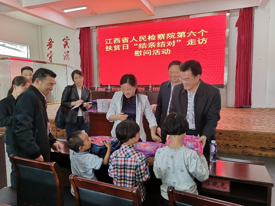 机关党委组织党员干部来到省院定点扶贫的抚州市宜黄县二都镇白槎村,开展以“结亲结对走访,心连心帮扶”为主题的扶贫日活动,现场走访慰问15户贫困户和1名困难老党员,向白槎村小学赠送文体用品和炊具,向村党支部赠送“不忘初心、牢记使命”主题教育书籍。